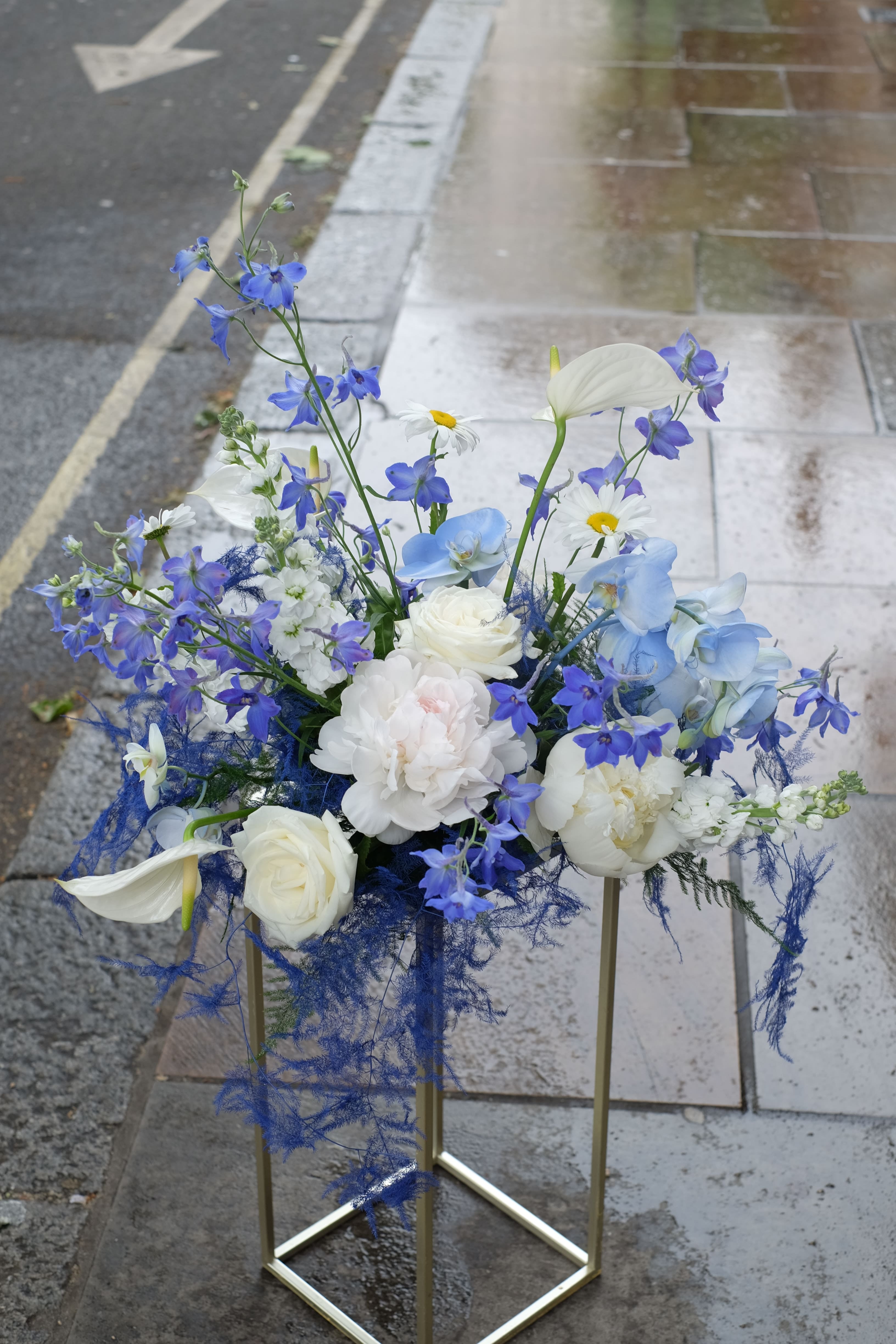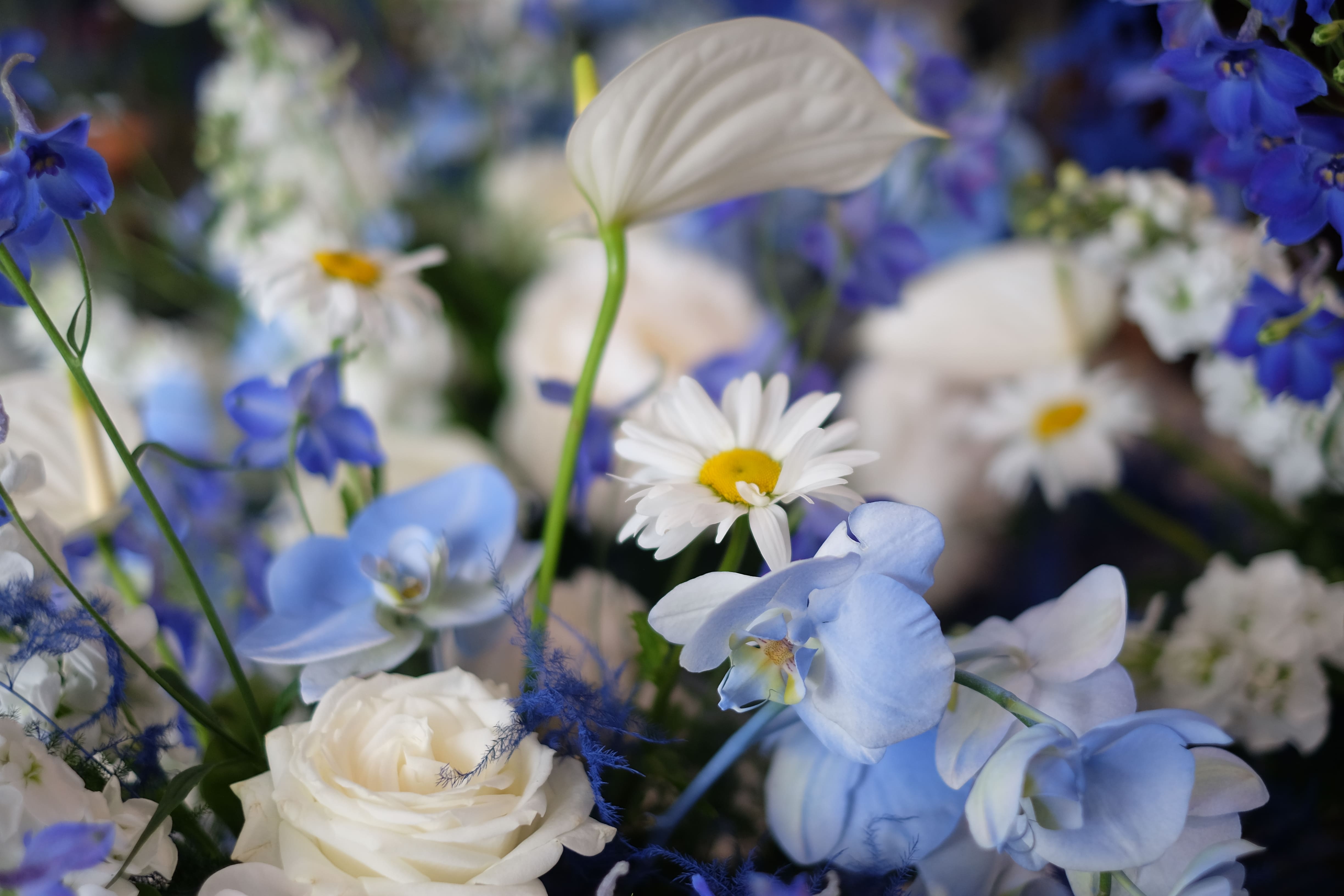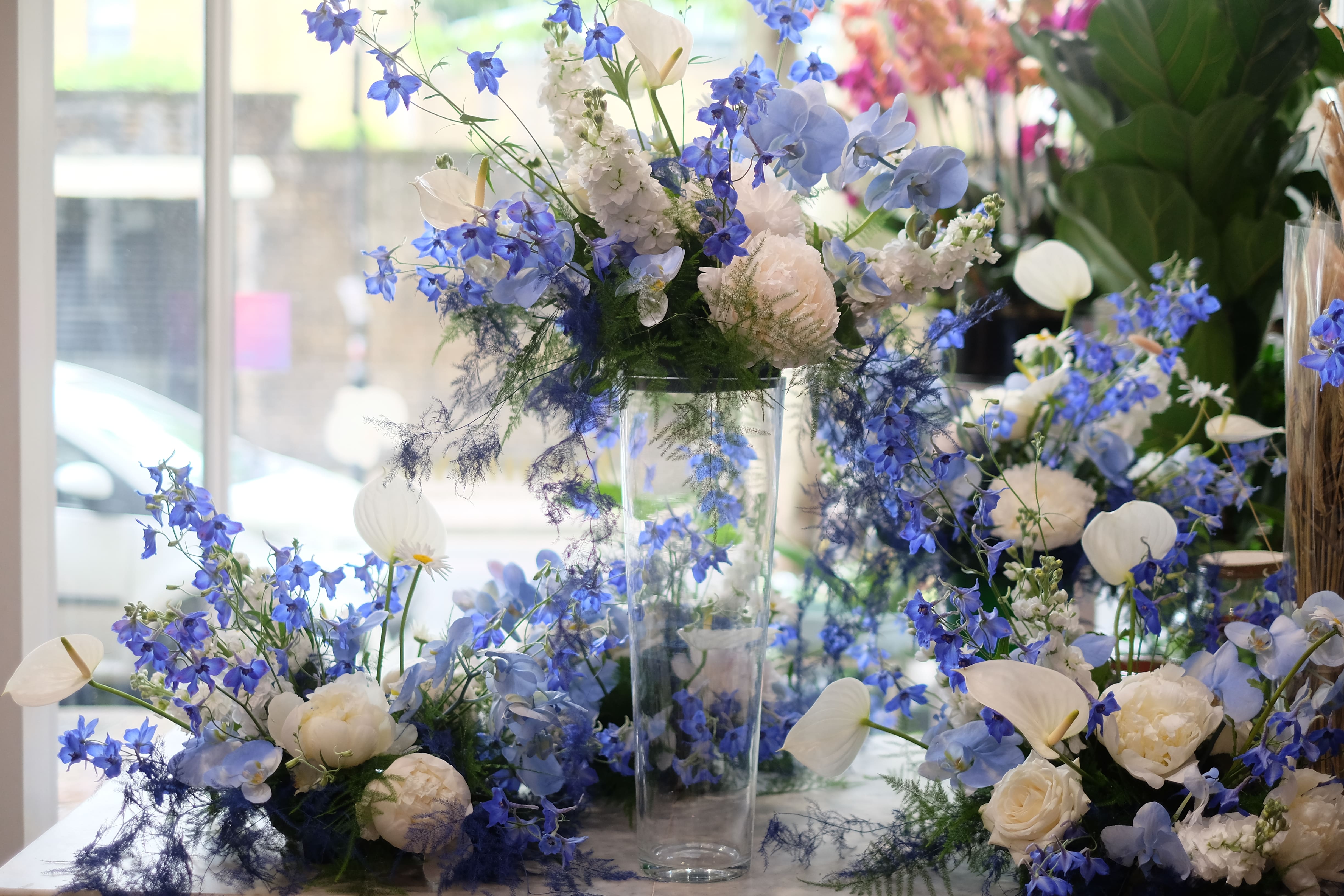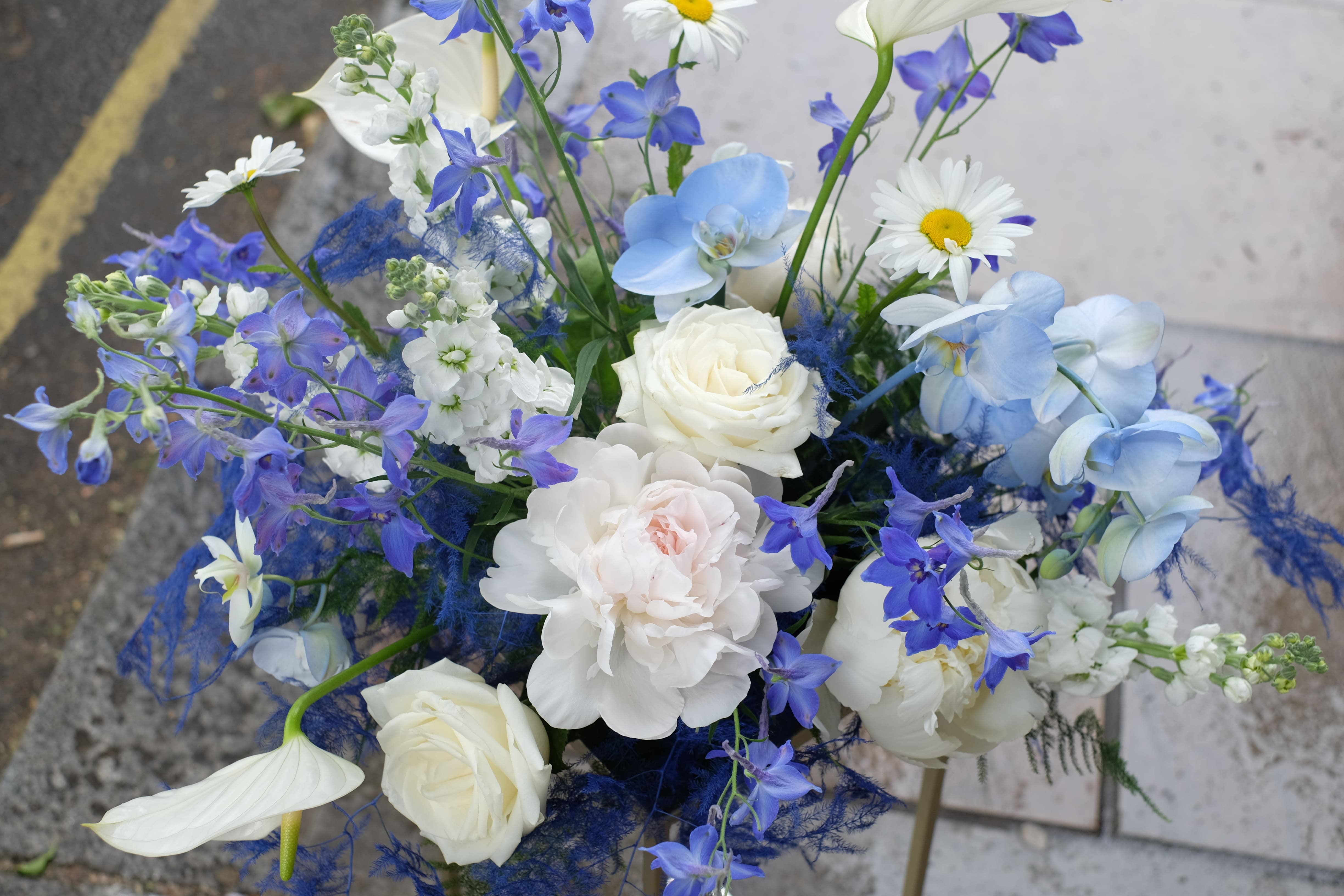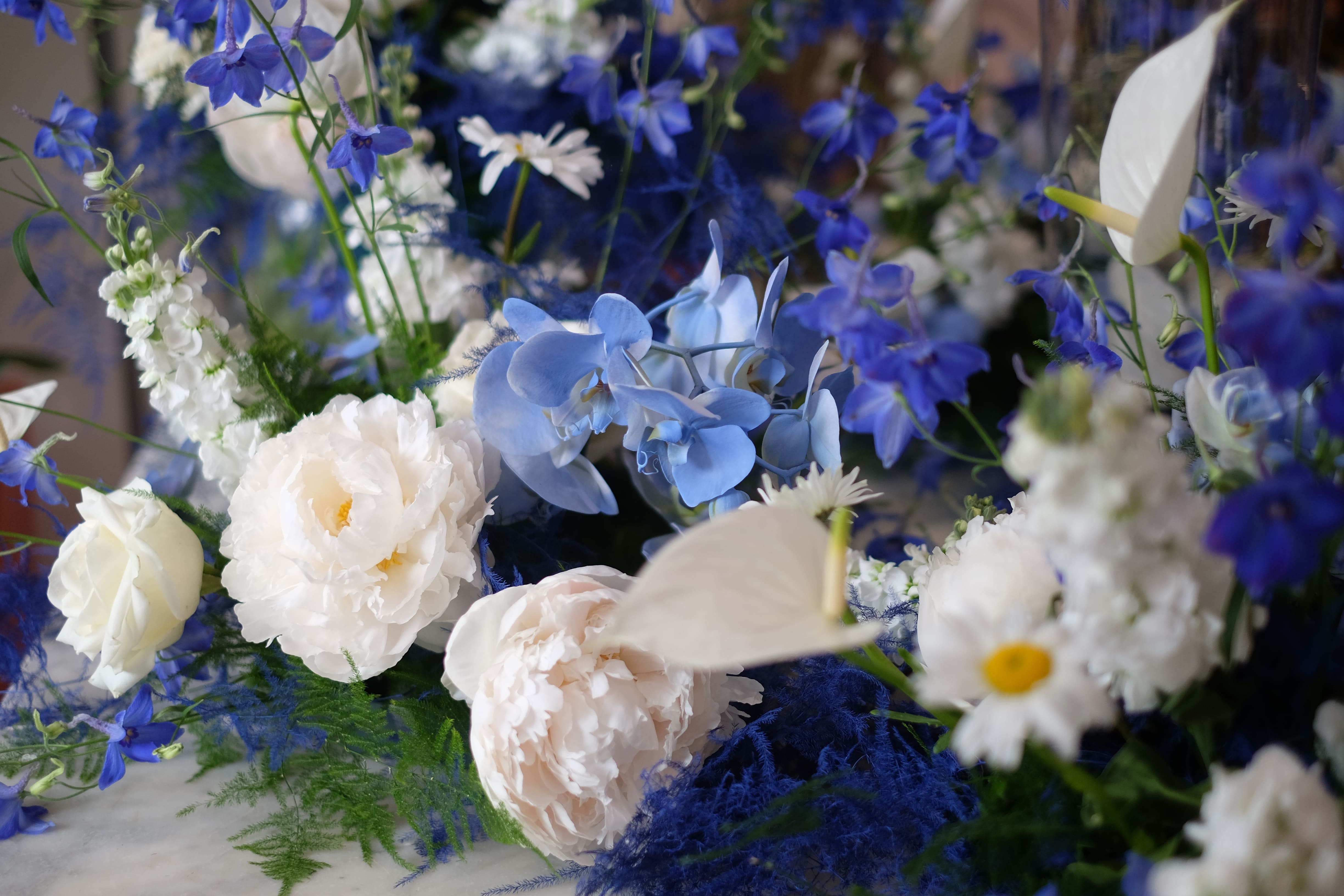 Blue may not be the typical choice, but it certainly adds a touch of magic to any event. For this special occasion, we embraced a beautiful blue and white colour scheme, using exquisite blue orchids, roses, and more. Our summer arrangements and table centrepieces featured a stunning combination of blue orchids, delicate roses, peonies, delphiniums, white calla lilies, and other blooms, creating the perfect "flower cloud" effect. It was a truly breathtaking display, blending elegance and a hint of the extraordinary.
