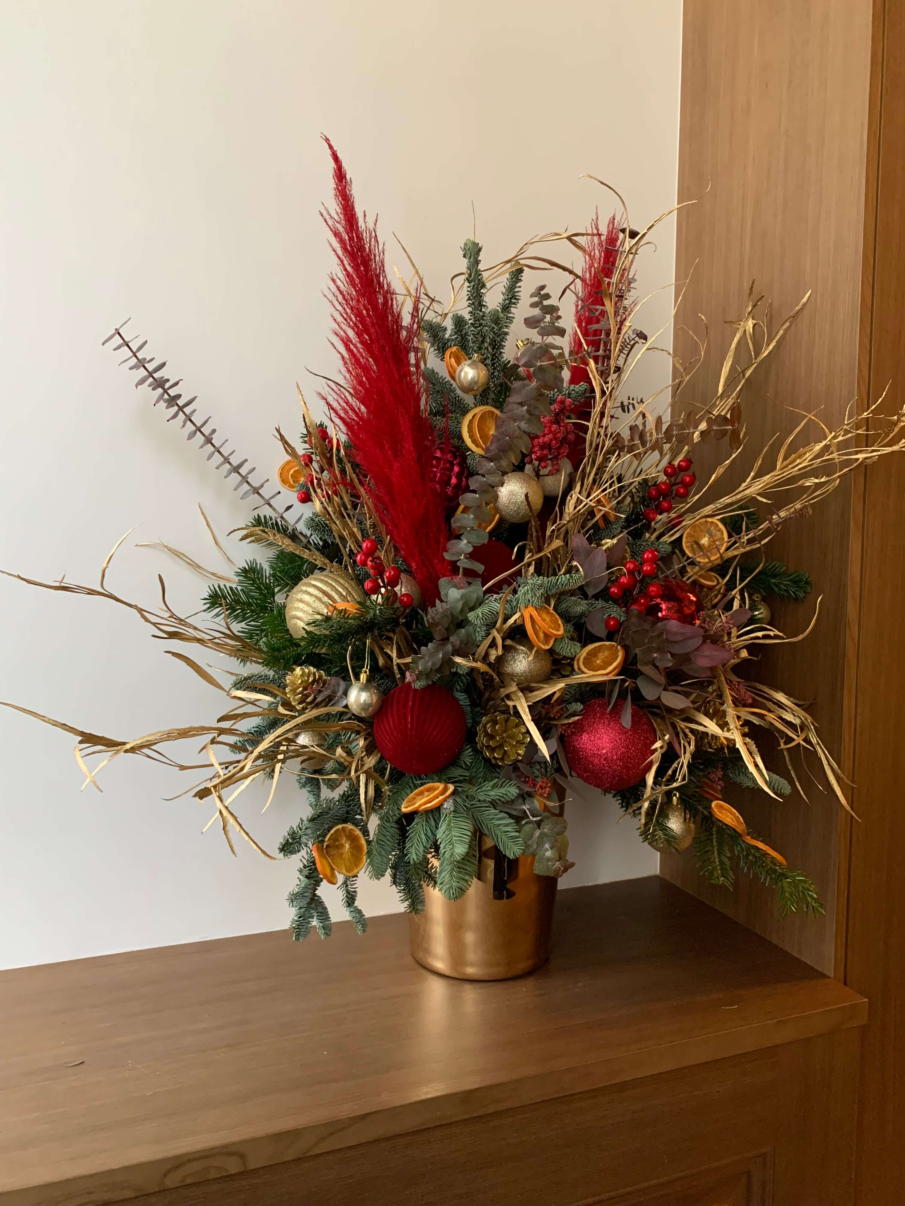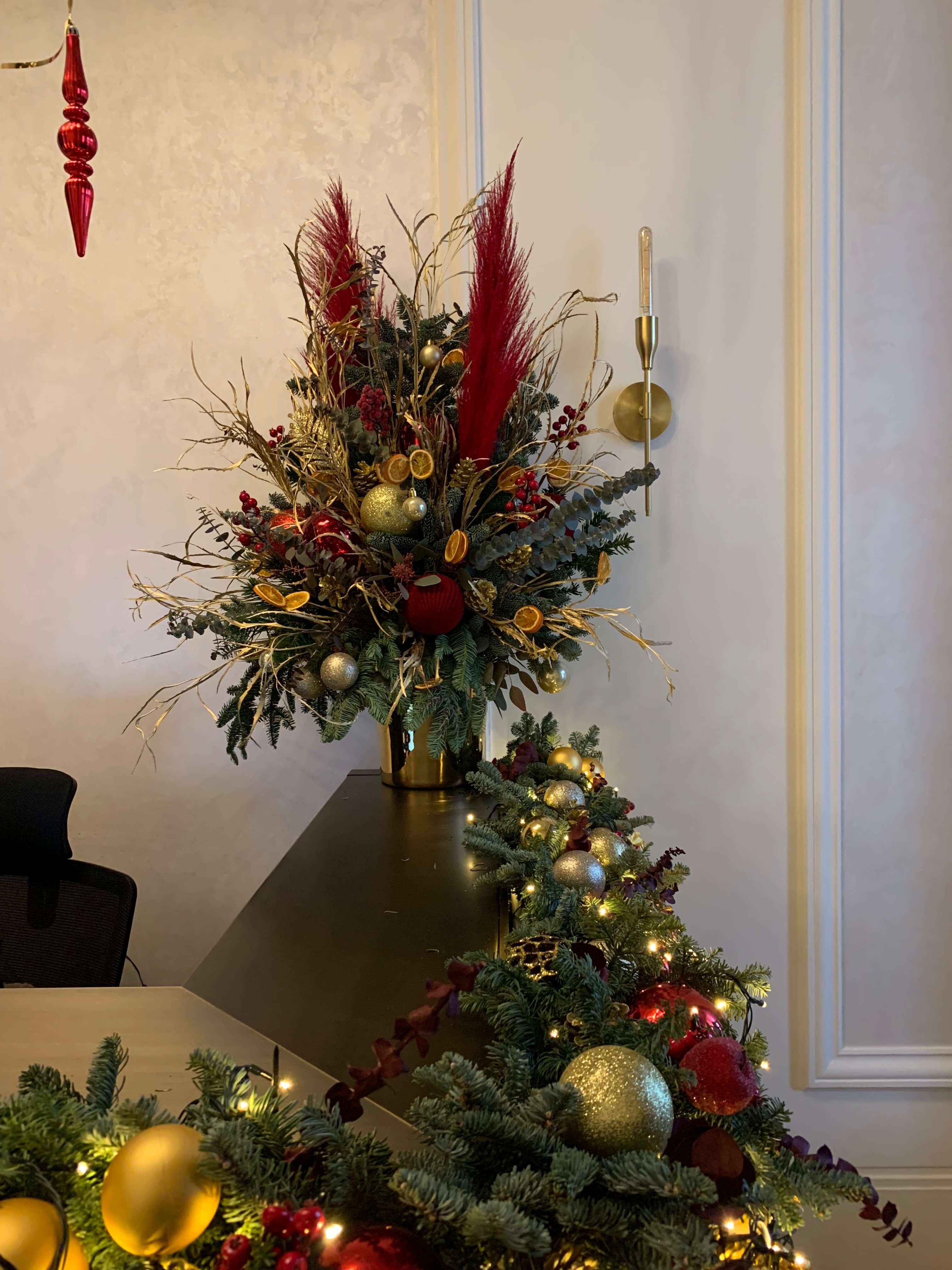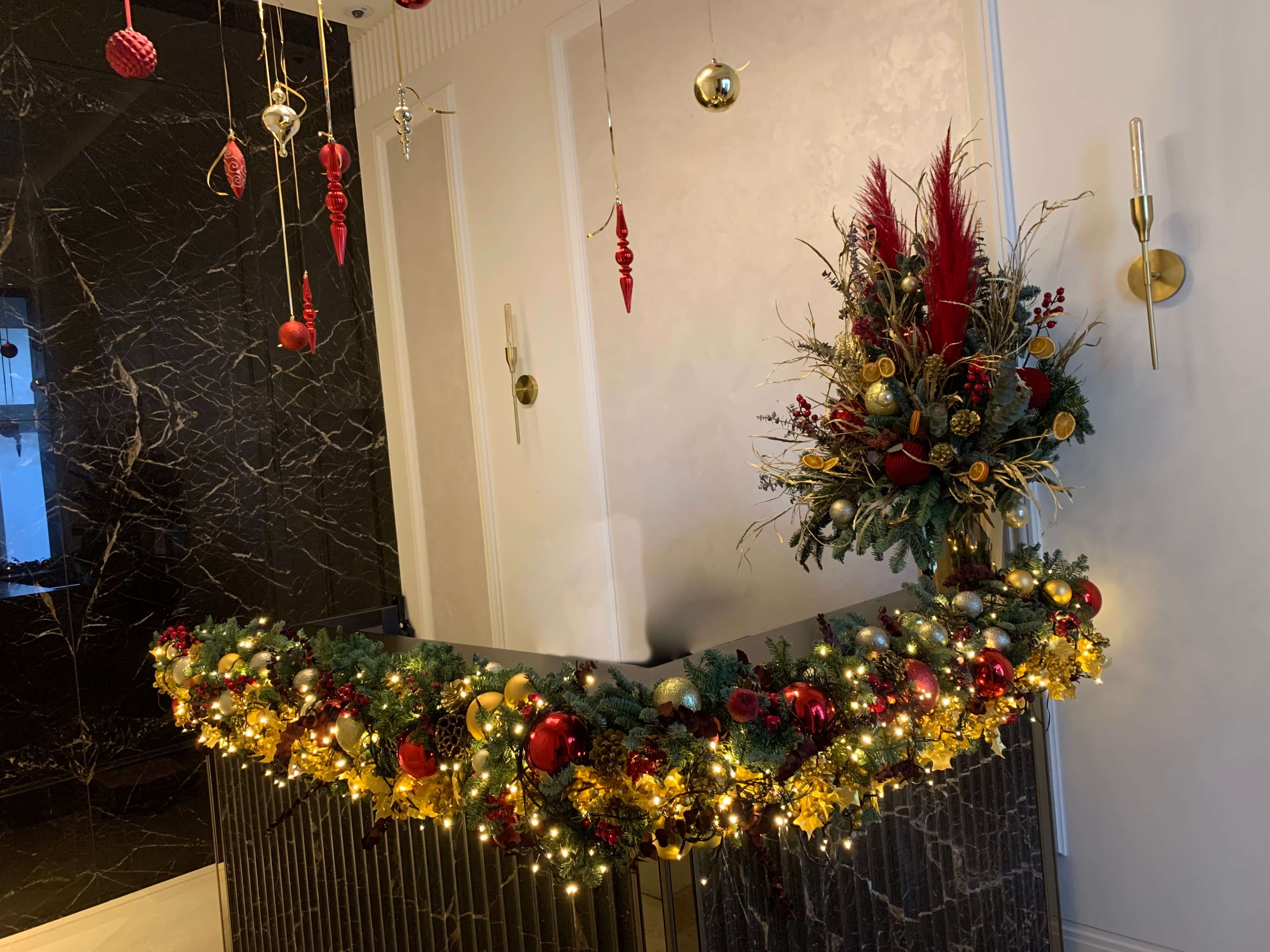 Across various locations in London, we have had the pleasure of working with a range of establishments to bring the festive spirit to life. While the Christmas tree often takes centre stage, our decorations go far beyond that. For this particular space, we opted for an elegant red and sparkling gold theme, crafting a stunning door wreath, exquisite flower arrangements, and a beautiful reception garland. Let us know your requirements, and we will tailor the perfect festive décor to suit your needs.