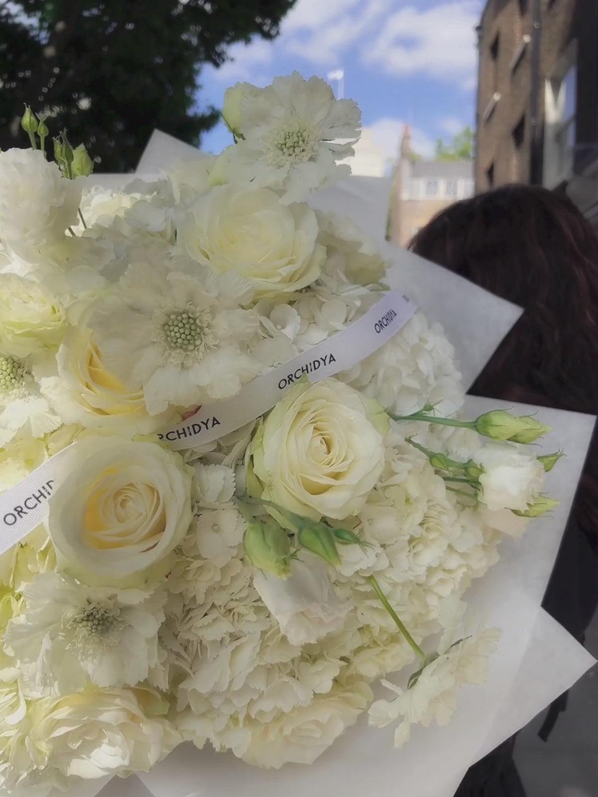 This pure white yet truly angelic bouquet brings a whole new meaning to white florals through its combination of hydrangeas, roses, and more. Each bloom whispers blissful elegance and freshness.