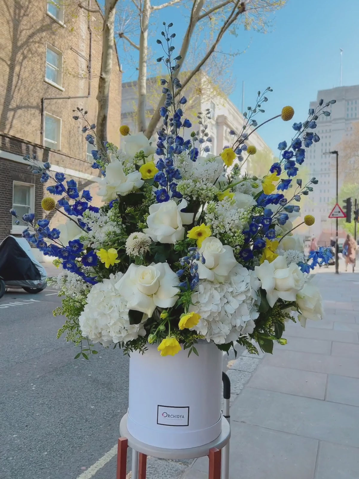 A luxurious flower box that encapsulates the essence of spring in all its glory. This captivating arrangement features a delightful combination of white hydrangeas, lilac and roses, adorned with delicate blue delphiniums and hints of cheerful yellow.