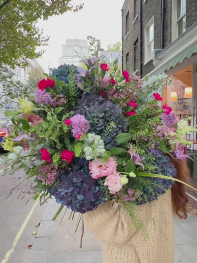 Enchanted captures the magic of autumn in full bloom - a lush, whimsical bouquet brimming with rich seasonal flowers and deep blue hydrangeas. It’s a spell of colour and texture, where every stem tells a story of crisp mornings and golden afternoons. Perfect for gifting or bringing a little autumn enchantment into your own home.