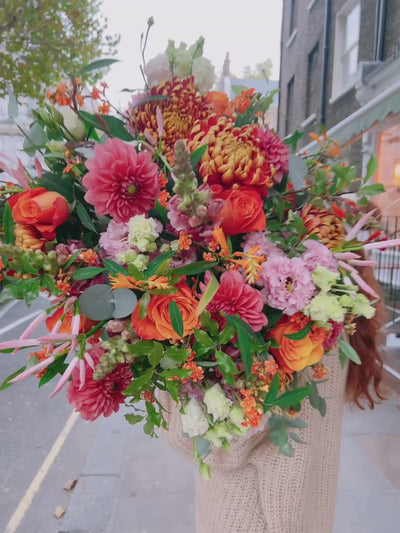 A show-stopping autumn bouquet that celebrates the season in full colour. Bursting with vibrant oranges and soft pinks, it features dahlias, roses, lisianthus, and abundant seasonal foliage. Rich, warm, and effortlessly charming, this bouquet brings all the magic and beauty of autumn into one truly stunning arrangement.