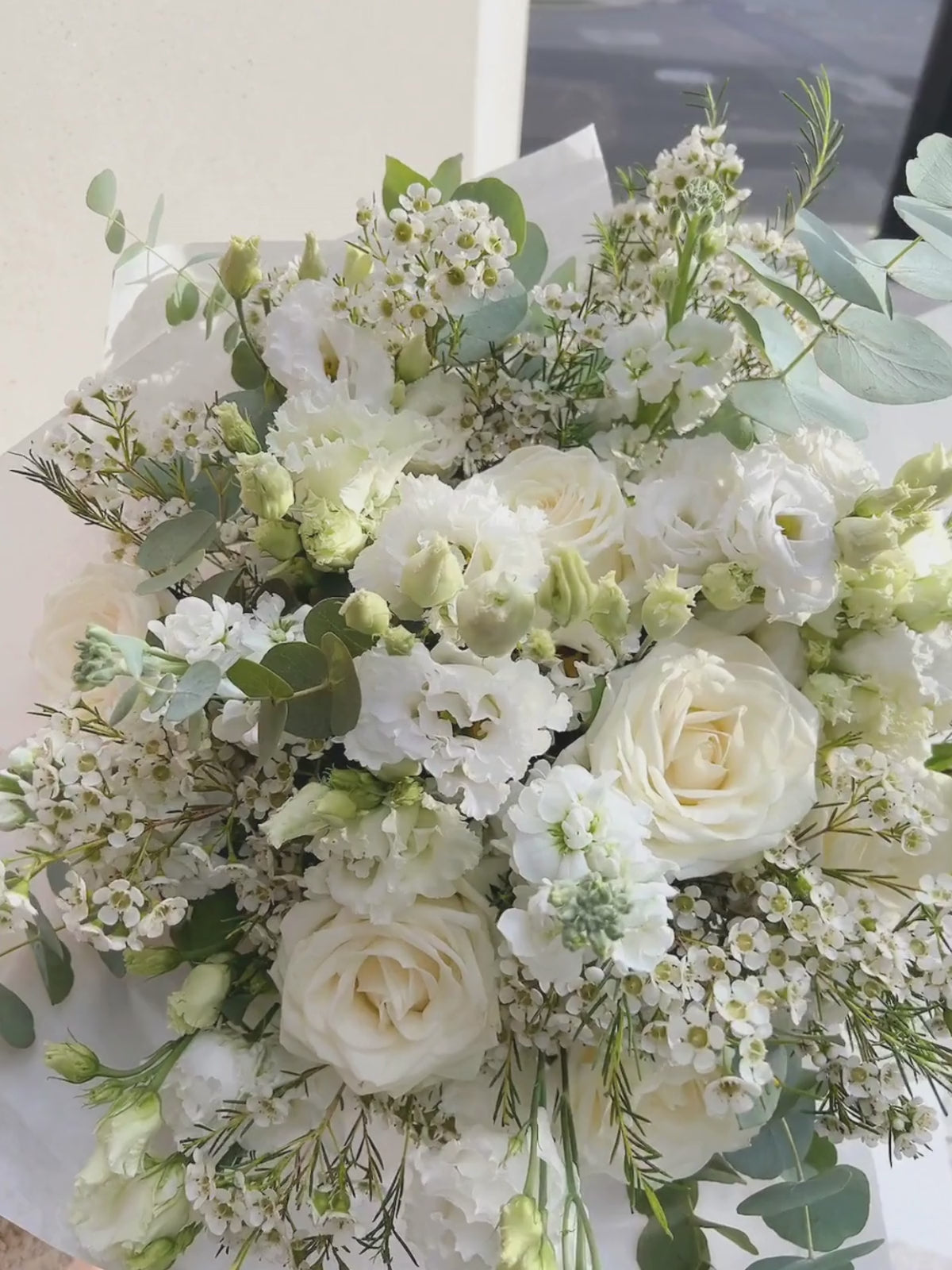 A gorgeous white and green bouquet featuring elegant white lisianthus and roses, accented with seasonal winter blooms and lush eucalyptus. Ideal for celebrating birthdays, anniversaries, or any special occasion.