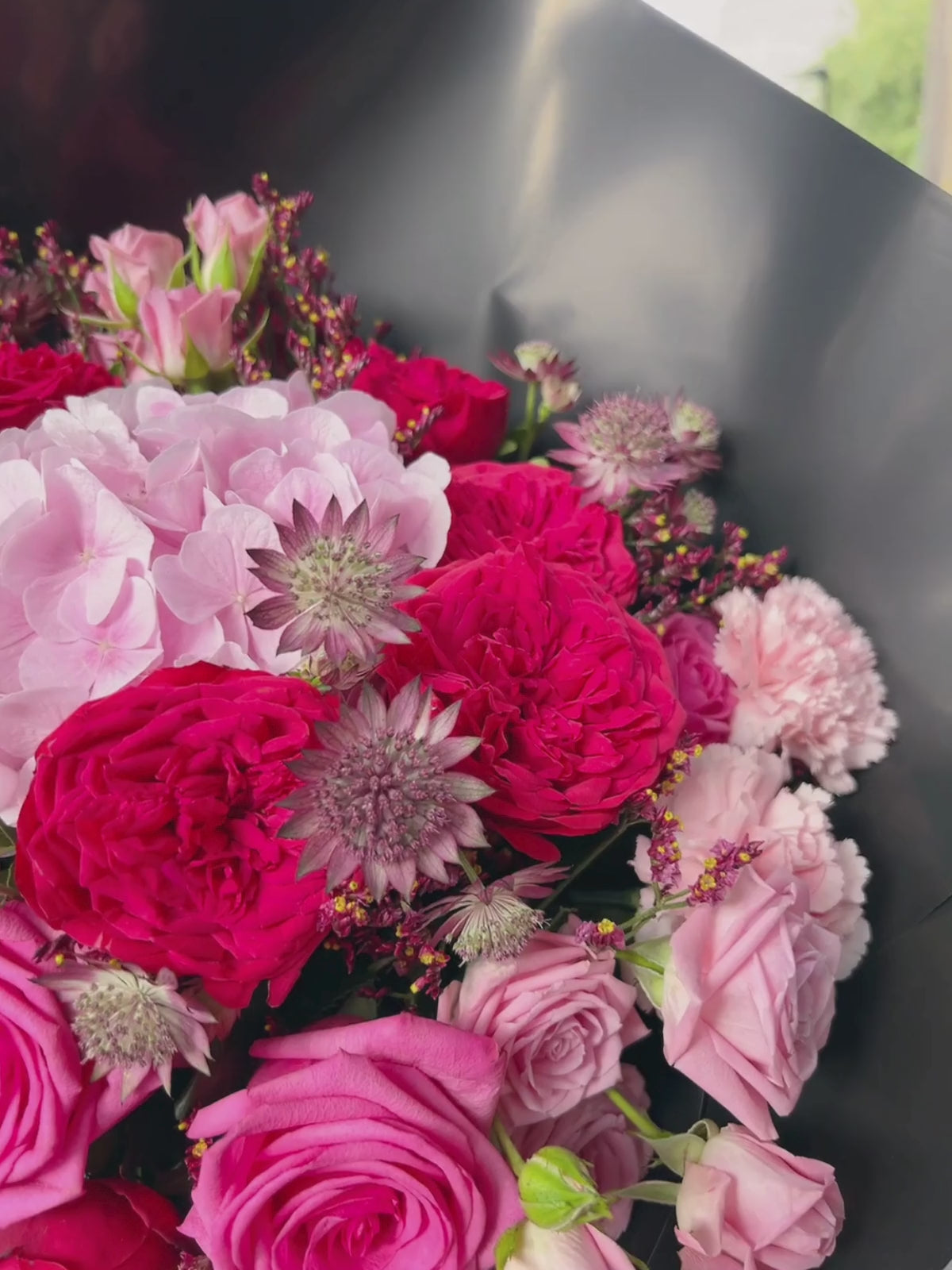 A floral Oasis, where all the shades of pink come together in luxurious harmony. This stunning bouquet features an opulent mix of roses, hydrangeas, and carnations, creating a lush and vibrant arrangement. Overflowing with soft, romantic tones, this bouquet is the perfect expression of beauty, bringing a splash of joy to any space or occasion.