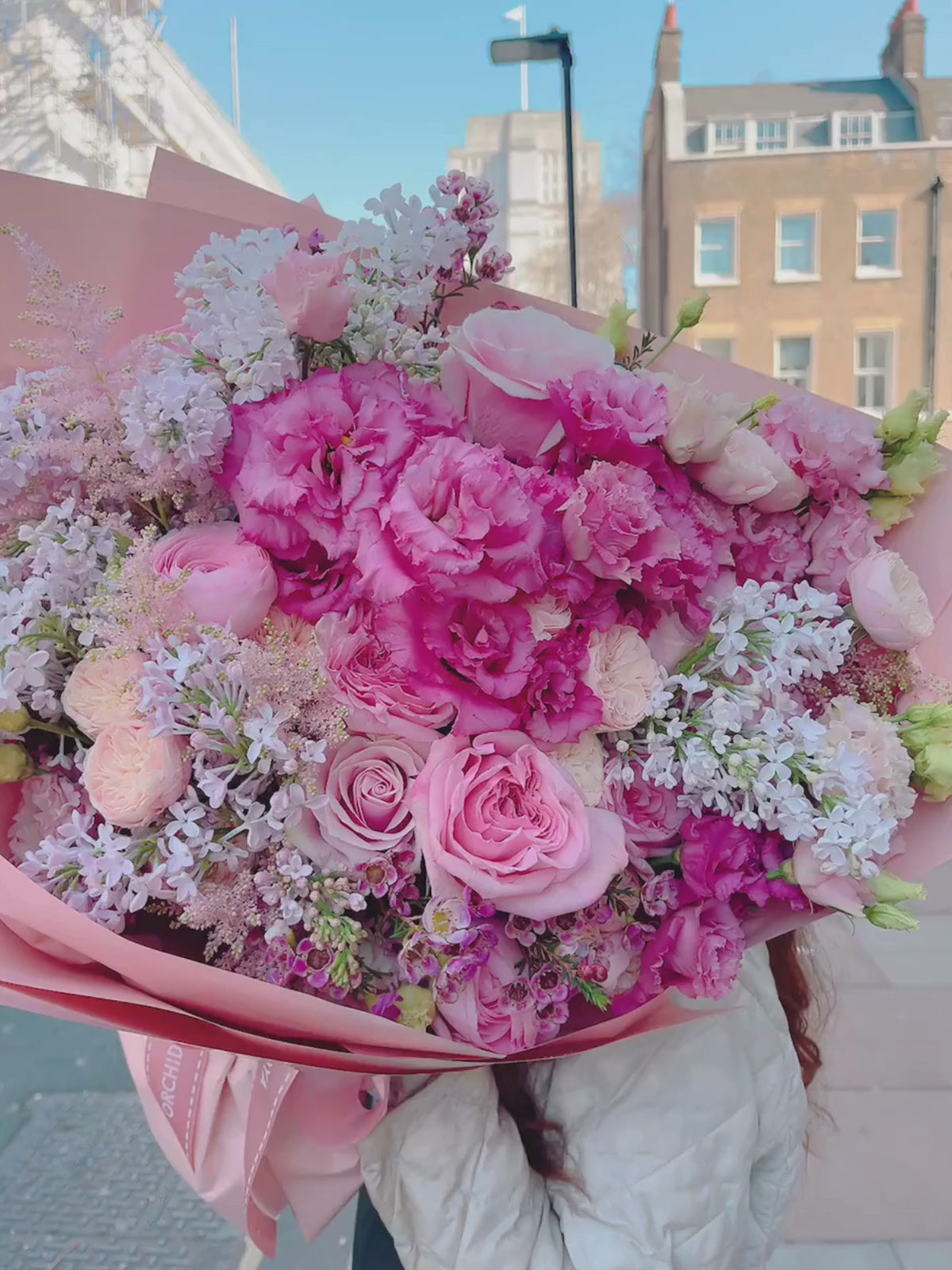 Pink ranunculus, roses and lisianthus are paired with fragrant white lilac and seasonal blooms in Pretty Lady - a bouquet full of gentle charm and springtime sweetness. Light, romantic and effortlessly pretty, it’s a joyful way to celebrate someone special and brighten their day with beautiful flowers.